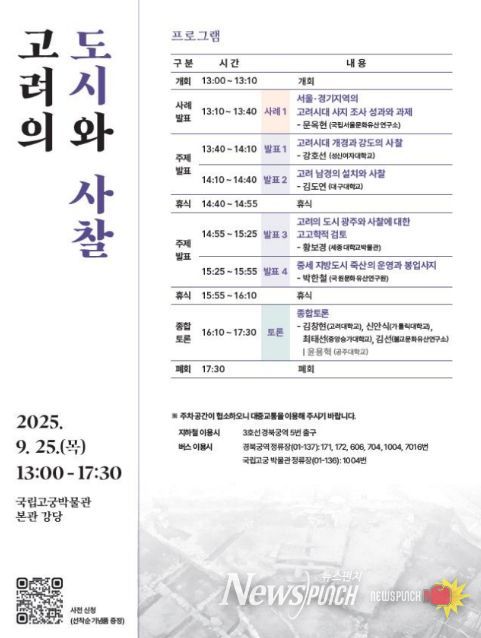 뉴스펀치 김희경 기자 | 국가유산청 국립문화유산연구원 국립서울문화유산연구소는 9월 25일 국립고궁박물관 본관 강당(서울 종로구)에서 ‘고려의 도시와 사찰’을 주제로 '제2차 중세문화포럼'을 개최한다.