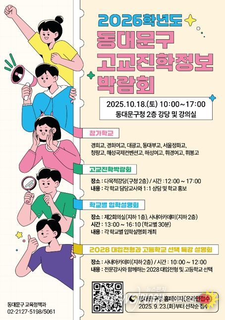뉴스펀치 김완규 기자 | 서울 동대문구는 오는 10월 18일 토요일 오전 10시부터 오후 5시까지 구청 내 다목적 강당, 제2회의실, 사내아카데미에서'2026학년도 고교 진학정보 박람회'를 개최한다고 밝혔다.