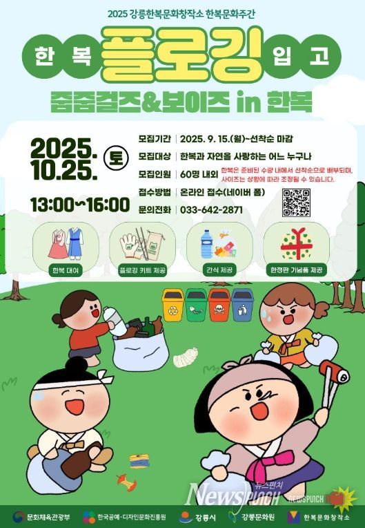 뉴스펀치 김길룡 기자 | 강릉한복문화창작소는 2025년 한복문화주간을 맞아 오는 10월 25일 한복 입고 플로깅 '줍줍걸즈·보이즈 in 한복'을 진행한다.