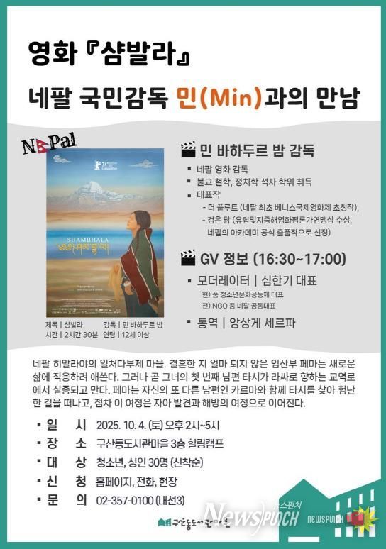 뉴스펀치 김완규 기자 | 서울 은평구는 내달 4일 오후 2시 영화 ’샴발라‘의 감독이자 네팔의 국민감독 민(Min)과의 만남을 구산동도서관마을에서 개최한다고 밝혔다.