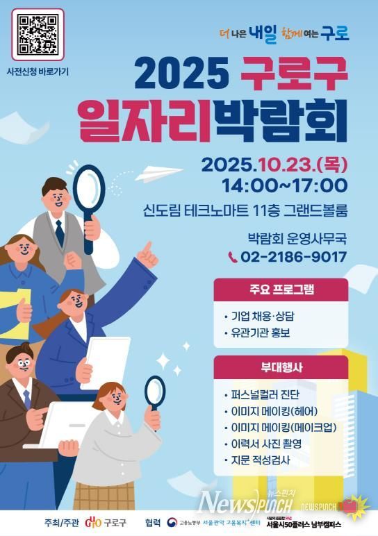 아울러 구는 9월 16일부터 10월 23일까지 행사 당일 혼잡을 줄이기 위해 참여를 원하는 구직자 대상으로 사전등록을 운영하며, 포스터의 큐알(QR)코드를 통해 신청하면 된다.