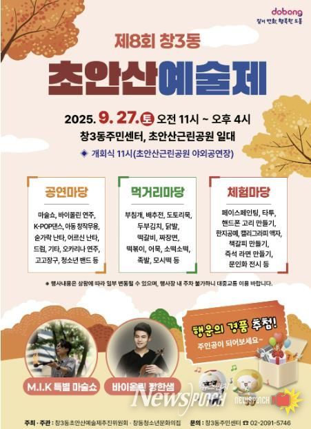 뉴스펀치 김완규 기자 | 서울 도봉구 창3동이 9월 27일 창3동주민센터와 초안산근린공원에서 ‘제8회 초안산예술제’를 개최한다.