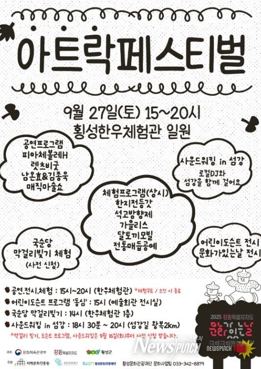 뉴스펀치 김길룡 기자 | 횡성문화관광재단은 ‘2025 문화가있는날-아트락페스티벌’을 오는 9월 27일 오후 3시부터 8시까지 횡성한우체험관 일원에서 개최한다고 밝혔다.