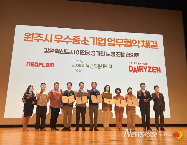 뉴스펀치 김길룡 기자 | 지난 22일 국민건강보험공단 건강홀에서 원주 지역 우수기업과 강원혁신도시 이전공공기관 노동조합 협의회 간 소비 판로 확대 및 상생협력을 위한 업무협약(MOU)이 체결됐다.
