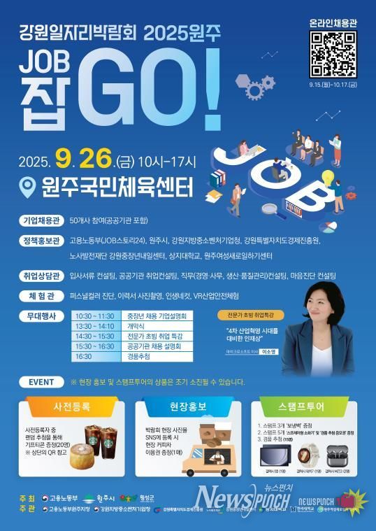 뉴스펀치 김길룡 기자 | 원주시와 고용노동부는 오는 26일 오전 10시부터 오후 5시까지 원주국민체육센터에서 ‘강원일자리박람회 2025 원주 잡(JOB) GO!’를 개최한다.