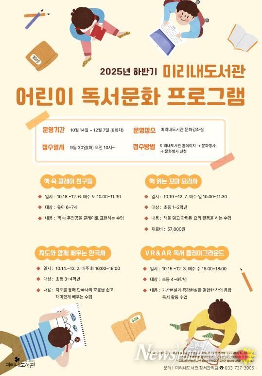 뉴스펀치 김길룡 기자 | 원주시 미리내도서관은 오는 10월부터 유아와 초등학생을 대상으로 한 하반기 어린이 독서문화 프로그램을 운영한다.