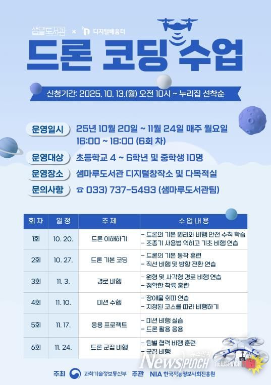 뉴스펀치 김길룡 기자 | 원주시 샘마루도서관은 과학기술정보통신부가 주최하고 한국지능 정보사회진흥원에서 주관하는 ‘디지털 역량 강화 교육: 드론 코딩 수업’을 10월 20일부터 11월 24일까지 운영한다.