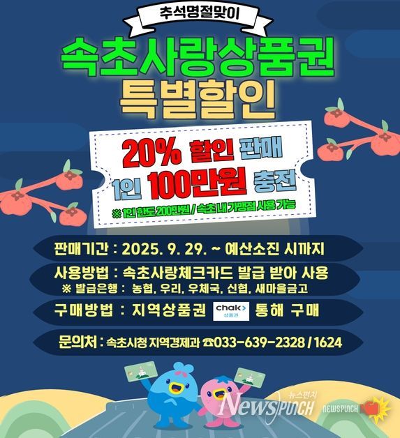 뉴스펀치 김길룡 기자 | 속초시가 추석 명절을 맞아 지역경제 활력 제고와 시민들의 장보기 부담을 덜기 위해 총 46억 원 규모의 ‘속초사랑상품권’을 발행한다.