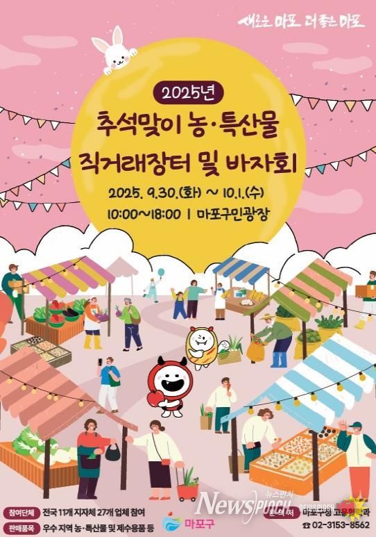 뉴스펀치 김완규 기자 | 마포구는 오는 9월 30일부터 10월 1일 양일간, 오전 10시부터 오후 6시까지 마포구민광장에서 ‘2025년 추석맞이 농·특산물 직거래장터 및 바자회’를 개최한다.