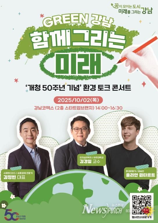뉴스펀치 김완규 기자 | 꿈이 모이는 도시, 미래를 그리는 강남구가 개청 50주년을 기념해 오는 10월 2일 오후 2시 코엑스 스타트업브랜치에서 ‘GREEN 강남, 함께 그리는 미래’를 주제로 ‘환경 토크 콘서트’를 개최한다.