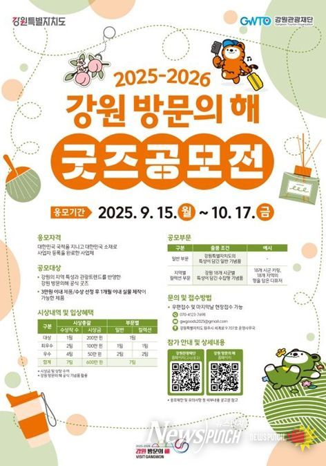 뉴스펀치 김길룡 기자 | 강원특별자치도와 강원관광재단은 ‘2025-2026 강원 방문의 해’를 기념하여 독창적인 관광 기념품을 발굴하기 위한 ‘굿즈 공모전’을 개최한다.