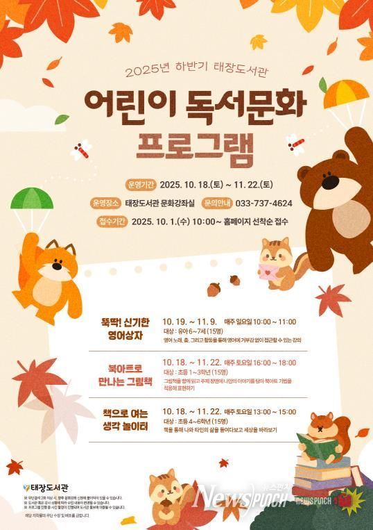 뉴스펀치 김길룡 기자 | 원주시 태장도서관은 관내 어린이들을 대상으로 2025년 하반기 어린이 독서문화 프로그램을 운영한다.