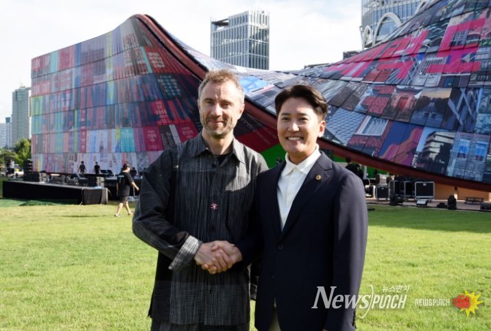 뉴스펀치 김완규 기자 | 서울특별시의회 주택공간위원회 이민석 부위원장(국민의힘, 마포1)은 25일 개막을 하루 앞둔 '제5회 서울도시건축비엔날레' 현장을 찾아 최종 준비 상황을 점검했다. 이날 점검에는 이번 비엔날레의 총감독을 맡은 토마스 헤더윅(Thomas Heatherwick)이 함께했다.