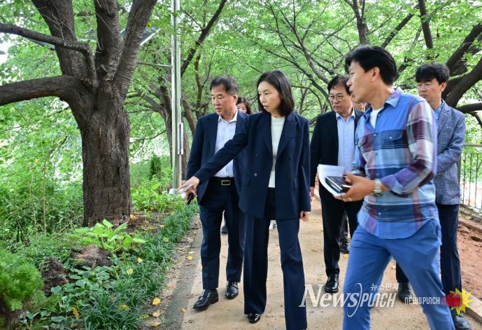 뉴스펀치 김완규 기자 | 최호정 서울특별시의회 의장은 26일 안양천 생태연못 일대를 방문해 수목 등 식재된 조경 상태를 살피고 관계자들과 조경 유지관리 개선방안을 모색했다.
