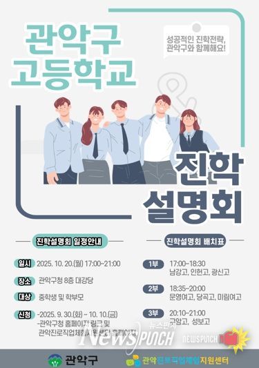 뉴스펀치 김완규 기자 | 관악구가 중학생과 학부모를 대상으로 오는 10월 20일 개최하는 ‘관악구 고등학교 진학설명회’ 참가자를 모집한다.