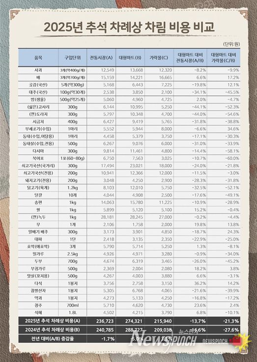뉴스펀치 김완규 기자 | 서울시농수산식품공사는 추석 명절 장보기에 도움이 되는 정보를 시민에게 제공하고자 서울시 내 대형마트, 전통시장, 가락시장(가락몰) 총 25곳을 대상으로 진행한 ‘추석 차례상 차림 비용’ 조사 결과를 발표했다.