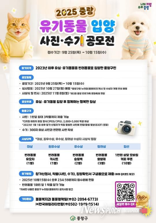 뉴스펀치 김완규 기자 | 중랑구는 유기 동물 입양에 대한 사회적 관심을 반영하고, 생명존 중 문화 확산을 위해 ‘2025 중랑 유기 동물 입양 사진·수기 공모전’을 개최한다. 공모 기간은 9월 25일부터 10월 15일까지다.