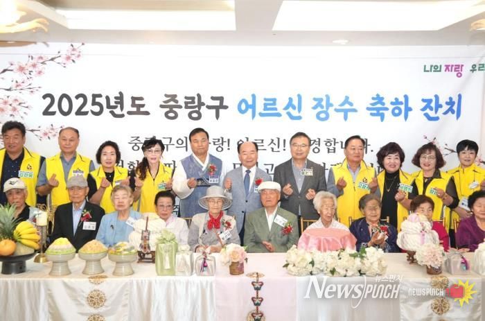 뉴스펀치 김완규 기자 | 중랑구는 지난 9월 26일, 중랑구 효사랑봉사회 주관으로 ‘2025년 중랑구 어르신 장수 축하 잔치’를 열고 동별 최고령 어르신과 가족들을 초청해 감사의 마음을 전하는 뜻깊은 시간을 가졌다.