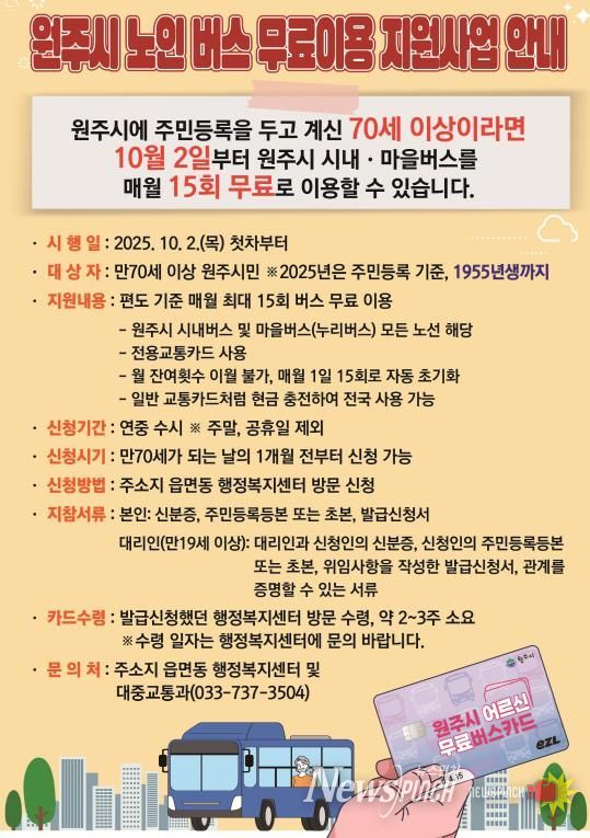 원강수 원주시장은 “어르신들의 이동 편의 향상과 경제적 부담 완화를 통해 건강하고 활기찬 노후를 지원하겠다”라며, “원주시가 노인복지 증진에 앞장서는 도시가 되도록 최선을 다하겠다”라고 말했다.