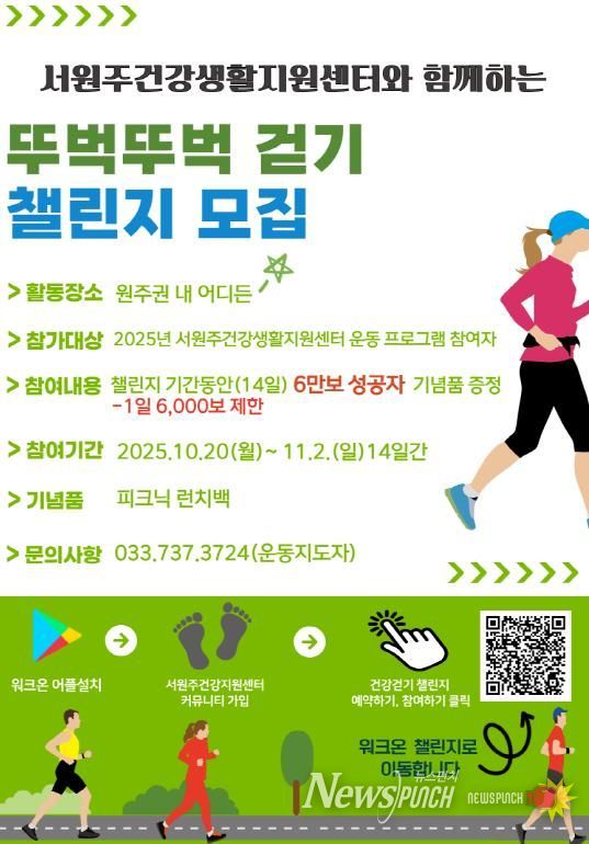 뉴스펀치 김길룡 기자 | 서원주건강생활지원센터는 지역 주민들의 건강 증진과 걷기 습관 형성을 돕기 위해 10월 20일부터 11월 2일까지 14일간 ‘뚜벅뚜벅 걷기 챌린지’를 운영한다.