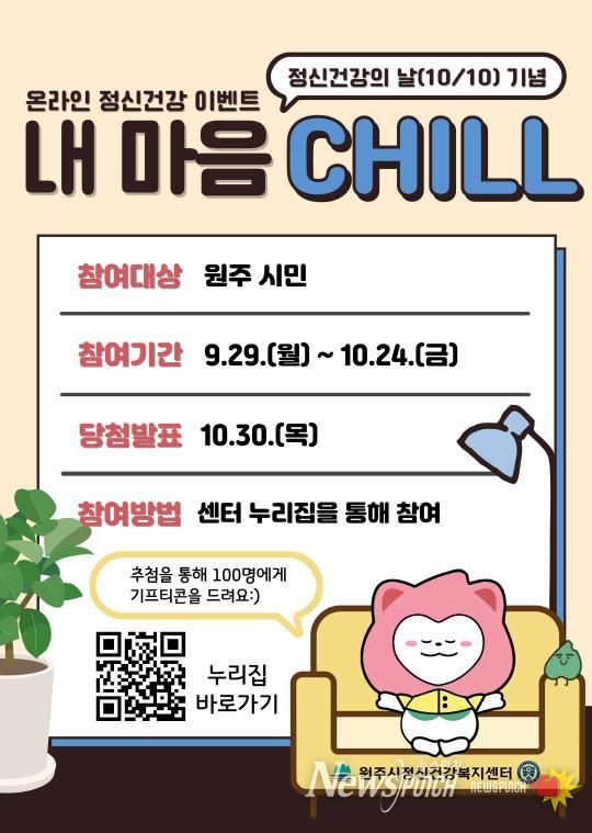 뉴스펀치 김길룡 기자 | 원주시정신건강복지센터는 정신건강의 날(10월 10일)을 기념해 9월 29일부터 10월 24일까지 온라인 정신건강 이벤트 ‘내 마음 칠(CHILL)’을 진행한다.