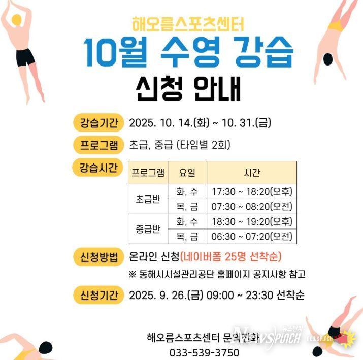 9월 강습이 조기 마감된 데 이어, 10월 강습 접수는 9월 26일 오전 9시부터 동해시시설관리공단 홈페이지에 안내되는 네이버 폼 링크를 통해 선착순으로 진행될 예정이다.