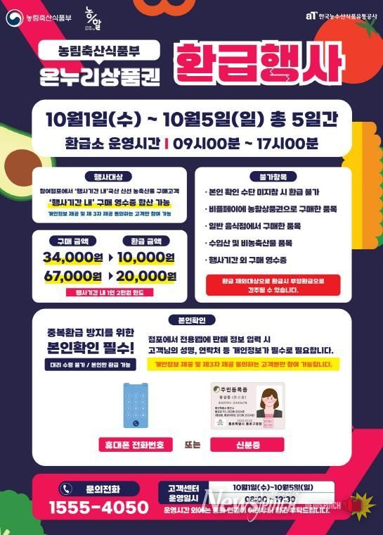 행사 기간 중 참여 점포에서 국산 신선 농축산물 또는 수산물을 구매한 소비자는 구매 금액의 최대 30%를 온누리상품권으로 환급받을 수 있다. 품목별(농축산물, 수산물)로 1인당 각각 2만 원까지 환급이 가능해, 두 부문을 모두 이용하면 최대 4만 원의 혜택을 받을 수 있다. 환급 금액은 ▲3만 4천 원 이상~6만 7천 원 미만 구매 시 1만 원, ▲6만 7천 원 이상 구매 시 2만 원이다.