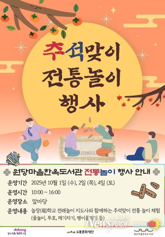 뉴스펀치 김완규 기자 | 서울 도봉구 도봉문화재단 원당마을한옥도서관이 10월 1일, 2일, 4일 도서관 앞마당 및 툇마루에서 ‘추석맞이 전통 놀이 행사’를 개최한다.