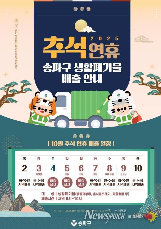 서강석 송파구청장은 “연휴 기간에도 청소상황실과 기동반을 가동해 주민 불편이 없도록 만전을 기하겠다”라며 “특히 10월 4~6일은 생활폐기물 수거가 어려운 만큼, 가정과 사업장에서는 배출을 자제해 주시길 당부드린다”라고 전했다.