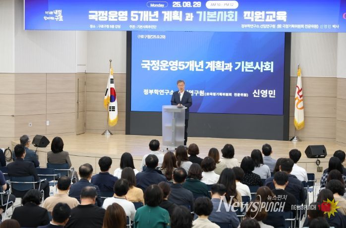 뉴스펀치 김완규 기자 | 구로구가 29일 구청 강당에서 전 직원을 대상으로 ‘기본사회 교육’을 실시했다.