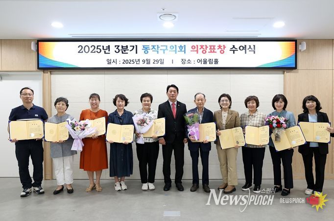 뉴스펀치 김완규 기자 | 동작구의회는 29일 의회 어울림홀에서 지역사회 발전에 기여한 ‘사당2동 자율방재단’ 등 3개 단체와 모범 구민 49명에게 의장 표창을 수여했다.