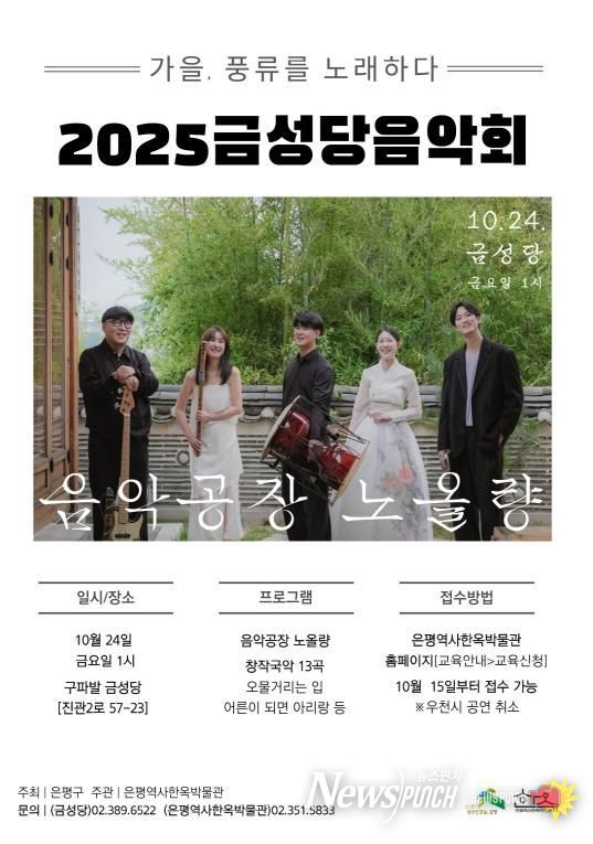 뉴스펀치 김완규 기자 | 서울 은평구는 10월 24일 오후 1시 은평뉴타운 아파트 숲 사이에 자리한 금성당에서 ‘음악회’를 개최한다고 밝혔다.