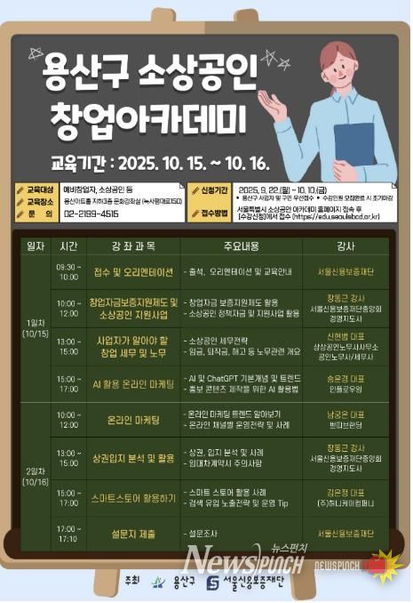 뉴스펀치 김완규 기자 | 서울 용산구가 서울신용보증재단과 함께 예비창업자와 소상공인의 성공적인 창업 지원을 위한 ‘2025 하반기 창업아카데미’를 개최한다.