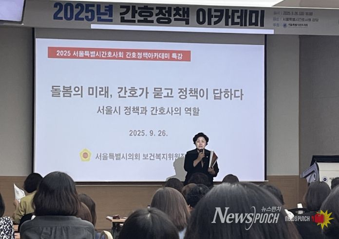 뉴스펀치 김완규 기자 | 서울특별시의회 보건복지위원회 김영옥 위원장(국민의힘, 광진3)은 9월 26일 서울특별시간호사회 5층 강당에서 열린 서울특별시간호사회 '2025 간호정책 아카데미'에서 ‘돌봄의 미래, 간호가 묻고 정책이 답하다’라는 주제로 특강을 진행했다.