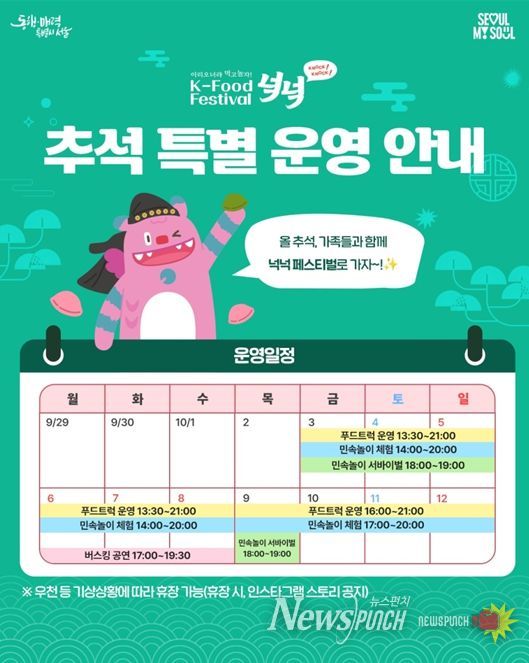 뉴스펀치 김완규 기자 | 전 세계를 휩쓴 케데헌(케이팝데몬헌터스) 열풍이 한국 음식 문화까지 확산되는 가운데, 서울시는 이를 한자리에서 즐길 수 있는 ‘K-푸드 페스티벌 넉넉’을 올 추석 연휴 동안 확대 운영하며, 명절 분위기를 더하는 전통놀이와 공연 프로그램을 선보인다고 밝혔다.