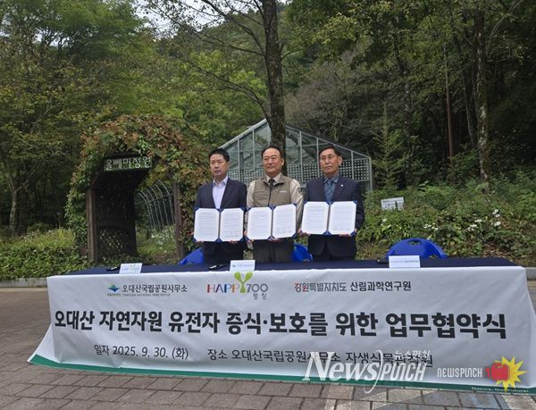 뉴스펀치 김길룡 기자 | 강원특별자치도 산림과학연구원은 9월 30일 국립공원공단 오대산국립공원사무소, 평창군과 우수 산림 유전자원 보존을 위한 업무협약을 체결하고, 오대산국립공원 내 보호수로 지정된 잎갈나무의 후계목을 육성하고 있다고 밝혔다.
