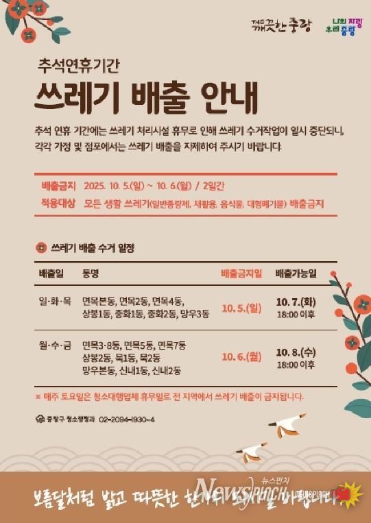 뉴스펀치 김완규 기자 | 중랑구는 다가오는 추석 연휴인 10월 3일부터 9일까지, 구민들이 건강하고 쾌적한 명절을 보낼 수 있도록 응급의료 서비스와 쓰레기 처리 대책을 동시에 추진한다.