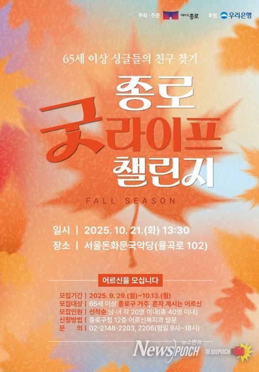 뉴스펀치 김완규 기자 | 종로구가 어르신들의 친구 찾기 프로그램 '종로 굿라이프 챌린지'참여자를 10월 13일까지 모집한다.