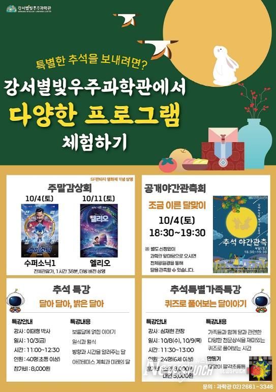 뉴스펀치 김완규 기자 | 서울 강서구는 추석 연휴를 맞아 강서별빛우주과학관(금낭화로 178)에서 특별 프로그램을 운영한다.