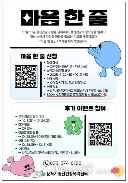 뉴스펀치 김길룡 기자 | 삼척시정신건강복지센터는 10월 10일 ‘정신건강의 날’을 기념하고 정신건강 주간(10월 10일 전후 1주간)을 맞아 지역 주민의 정신건강 인식 향상과 마음 돌봄의 중요성을 알리기 위해 ‘마음 한 줄’ 캠페인을 진행한다.