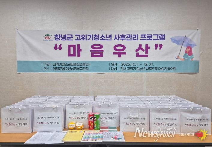 뉴스펀치 김길룡 기자 | 창녕군청소년상담복지센터(센터장·노인여성아동과장 김선희)는 자살 생각이나 습관적 자해 등으로 어려움을 겪는 고위기 청소년 50명을 대상으로 오는 12월 말까지 상담키트를 전달할 계획이라고 밝혔다.
