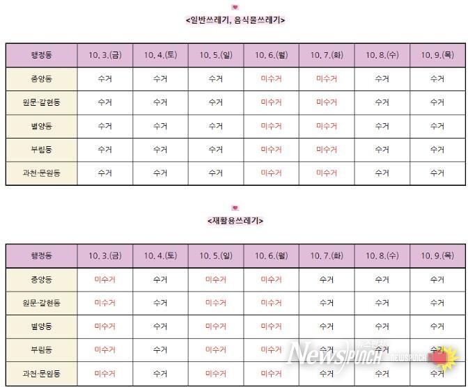 생활폐기물 수거는 일반 쓰레기의 경우 3일, 4일, 5일, 8일, 9일에, 재활용 쓰레기는 4일, 7일, 8일, 9일에 각각 수거된다.
