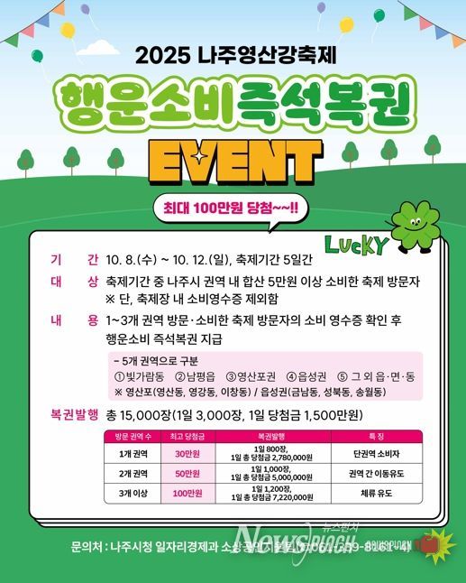 뉴스펀치 김길룡 기자 | 전라남도 나주시가 ‘2025 나주영산강축제’를 찾는 시민과 관광객들에게 특별한 즐거움과 함께 지역 상권 활력을 불어넣기 위해 ‘행운 소비 즉석 복권 이벤트’를 진행한다.