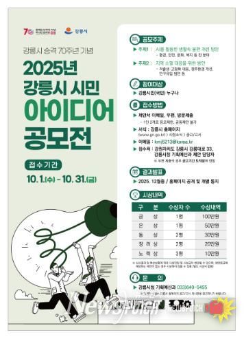 뉴스펀치 김길룡 기자 | 강릉시는 강릉시 승격 70주년을 맞아 시민의 창의적이고 혁신적인 의견을 시정에 반영하기 위해 ‘2025년 강릉시 시민 아이디어 공모전’을 10월 1일부터 10월 31일까지 31일간 개최한다.