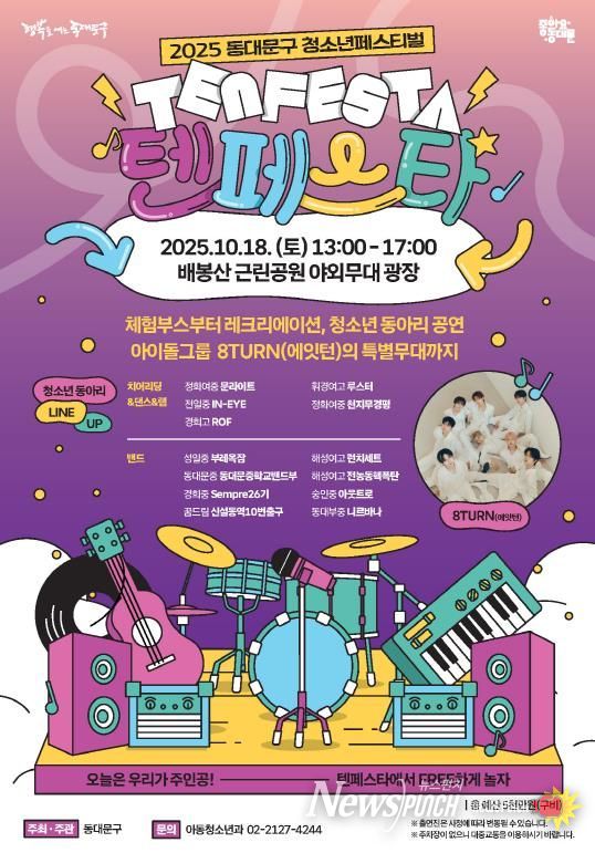 뉴스펀치 김완규 기자 | 서울 동대문구는 오는 18일 오후 1시부터 5시까지 배봉산근린공원 열린광장에서'2025 동대문구 청소년 페스티벌 ‘텐 페스타(TEN FESTA)’'를 개최한다고 밝혔다.