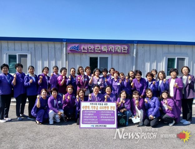 뉴스펀치 김길룡 기자 | 신안군 지역 복지 발전에 앞장서고 있는 신안군여성단체협의회(회장 안미영)를 비롯한 9개 여성 관련 단체 임원 32명은 1일 신안군복지재단(이사장 강정희)을 방문해 ‘어린이집 연합 한마음 대회’ 지원을 위한 기부금 410만 원을 쾌척하며 지역사회 어린이들을 위한 나눔을 실천했다.