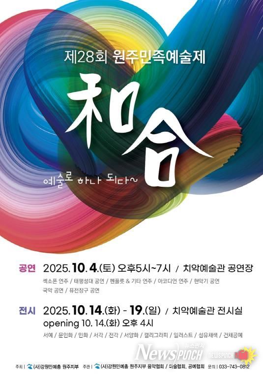 뉴스펀치 김길룡 기자 | (사)강원민예총 원주지부가 주최하는 ‘제28회 원주민족예술제’가 가을의 문을 열며 시민들에게 풍성한 문화적 감동을 선사한다. 치악예술관에서 열리는 이번 축제는 10월 4일 공연과 10월 14일부터 19일까지 진행되는 전시로 구성됐다.