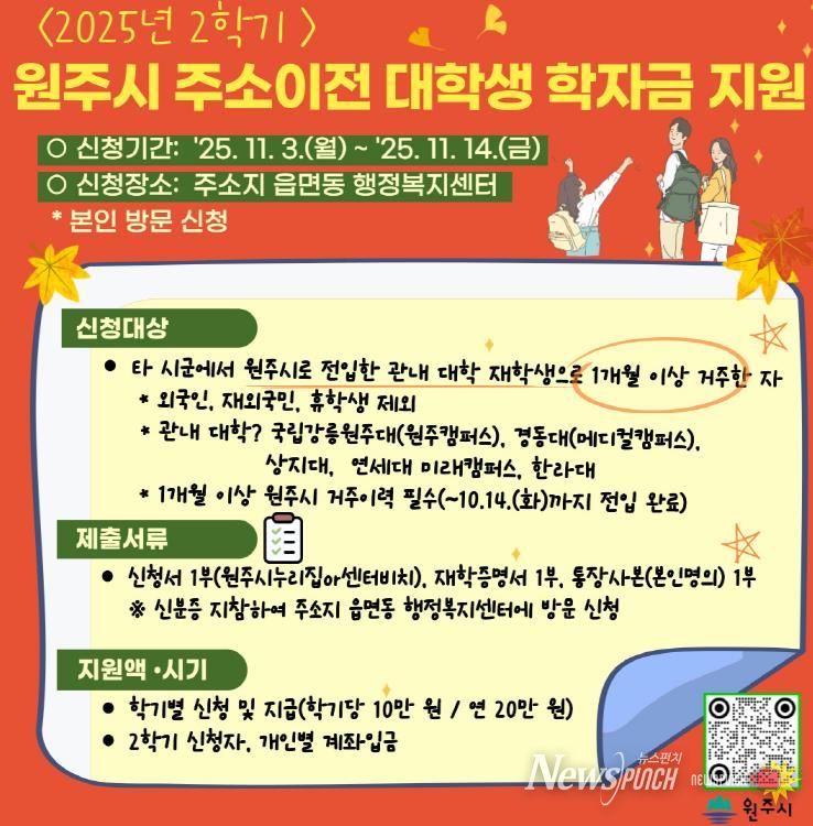 뉴스펀치 김길룡 기자 | 원주시는 전입신고를 마치고 원주시민이 된 관내 대학생에게 상·하반기 각 10만 원씩 연 20만 원의 학자금을 지원하고 있다.