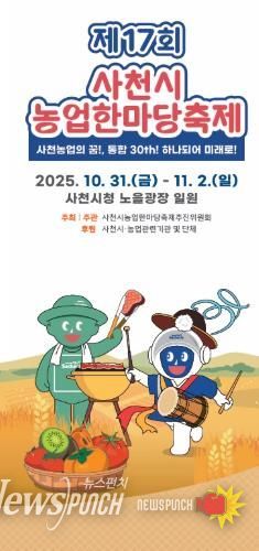 뉴스펀치 김길룡 기자 | 사천시의 대표적인 가을축제인 ‘제17회 사천시 농업한마당축제’가 오는 10월 31일부터 11월 2일까지 3일간 사천시청 노을광장 일원에서 열린다.