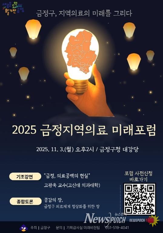 뉴스펀치 김길룡 기자 | 부산시 금정구는 오는 11월 3일 금정구청 1층 대강당에서 침례병원 파산 이후 지속되어 온 지역 의료공백 문제를 논의하고 의료체계 정상화 방안을 모색하기 위해 '금정 지역의료 미래 포럼'을 개최한다.